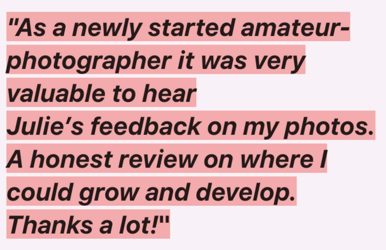 “Julie’s street photography workshop was relaxed and informative. It gave me a real boost to get back out on the streets with my camera. Julie shared great tips and examples to help find new inspiration and get clearer on what exactly I want to photograph on the street. That had been simmering for a while, but this workshop definitely gave me a push in the right direction!”